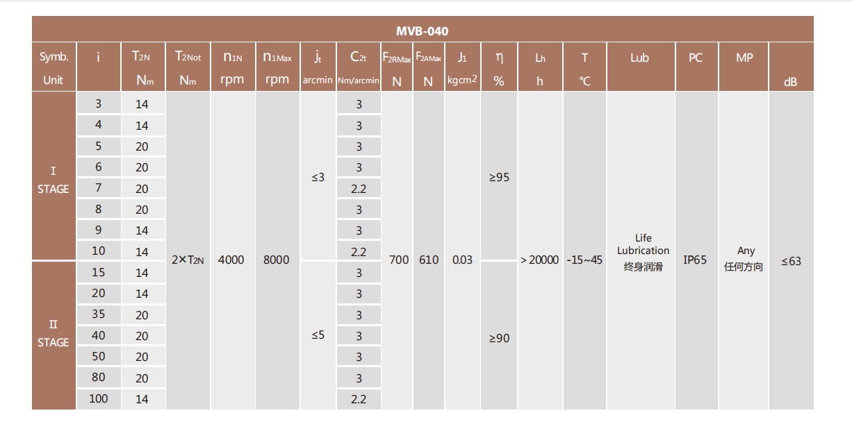 MVB-040-L2系列超精密背隙行星減速機(jī)系列(P0): MVB-040-L2系列精密背隙行星減速器系列(P1): MVB-040-L2系列標(biāo)準(zhǔn)背隙行星減速機(jī)系列(P2):
