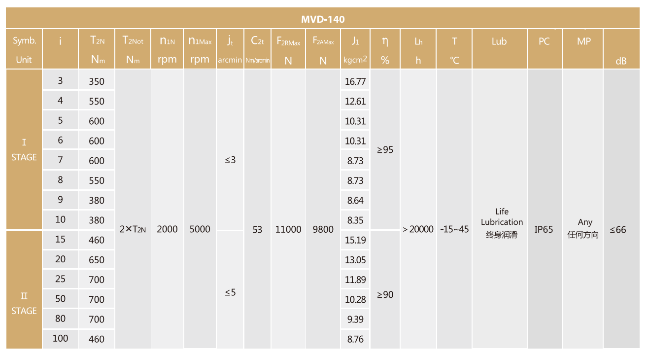 MVD-140-L2系列超精密背隙行星減速機系列(P0): MVD-140-L2系列精密背隙行星減速器系列(P1): MVD-140-L2系列標準背隙行星減速機系列(P2):