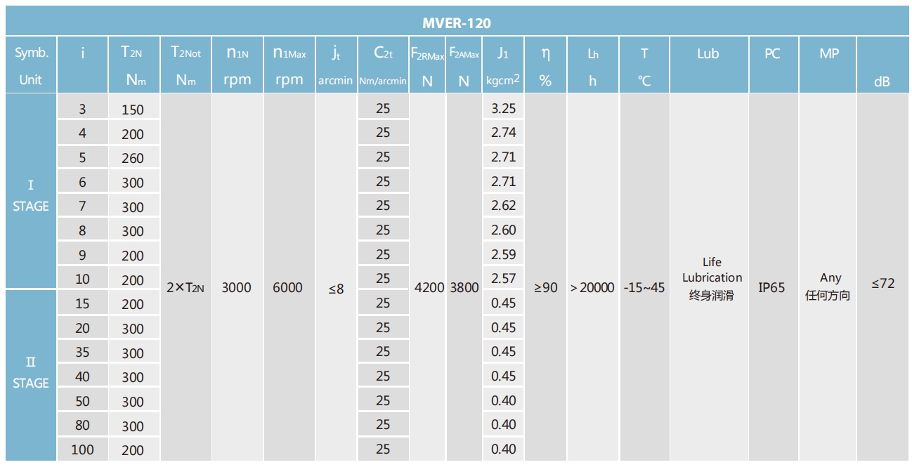 MVER-120-L1系列超精密背隙行星減速機系列(P0): MVER-120-L1系列精密背隙行星減速器系列(P1): MVER-120-L1系列標準背隙行星減速機系列(P2):