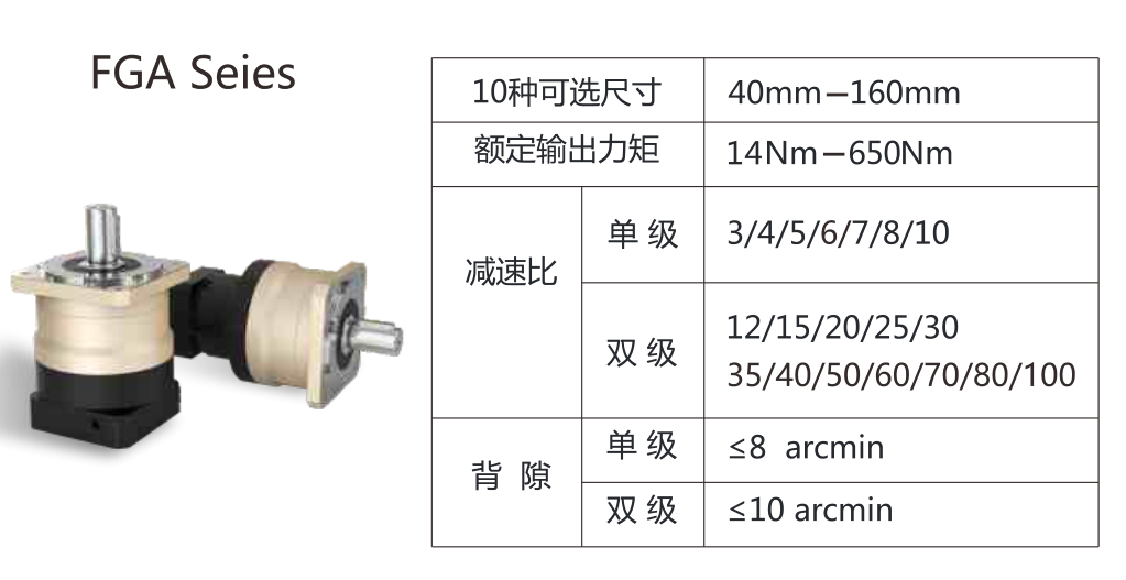 FGA系列行星減速機是我公司自主研發(fā)的新一代實用性產(chǎn)品,融合了國內(nèi)外先進的技術(shù),具有以下一些主要特點:低噪音:低于65db;低背隙單級可達1弧分內(nèi),雙級可達3弧分內(nèi);高效率:單段式在95%以上,雙段式在92%以上;高精密研磨的蝸線傘齒輪組可以達到400: 1的減速比。高扭矩低側(cè)隙的精簡結(jié)構(gòu)設(shè)計適用于精密伺服的應(yīng)用。免保養(yǎng)無需更換潤滑油,運轉(zhuǎn)壽命長。